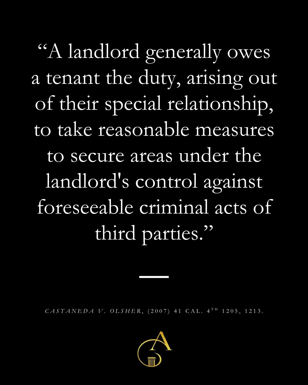 “A landlord generally owes a tenant the duty, arising out of their special relationship, to take reasonable measures to secure areas under the landlord’s control against foreseeable criminal acts of third parties.” (Castaneda v. Olsher (2007) 41 Cal.4th 1205, 1213, 63 Cal. Rptr. 3d 99, 162 P.3d 610 (Castaneda), citing Sharon P. v. Arman, Ltd. (1999) 21 Cal.4th 1181, 1189-1190, 91 Cal. Rptr. 2d 35, 989 P.2d 121 (Sharon P.) [“landlord[‘s] . . . general duty of maintenance includes ‘the duty to take reasonable steps to secure common areas against foreseeable criminal acts of third parties that are likely to occur in the absence of such precautionary measures,'” italics omitted] & Ann M. v. Pacific Plaza Shopping Center (1993) 6 Cal.4th 666, 674, 25 Cal. Rptr. 2d 137, 863 P.2d 207 (Ann M.) [same].) But “even when a special relationship gives rise to an affirmative duty to protect, a court must still consider whether the [foreseeability and] policy [factors] set out in Rowland [v. Christian (1968) 69 Cal.2d 108, 112-113, 70 Cal. Rptr. 97, 443 P.2d 561 (Rowland)] warrant a departure from that duty.